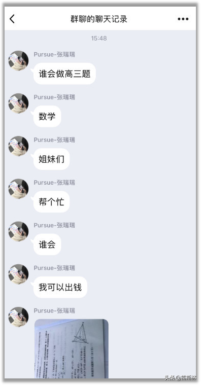 6月7日下午3点58分,一个叫做“Pursue-张瑞瑞“在QQ群里发了几张”高三数学题“的试卷图,并表示“帮个忙 谁会 我可以出钱”。