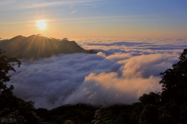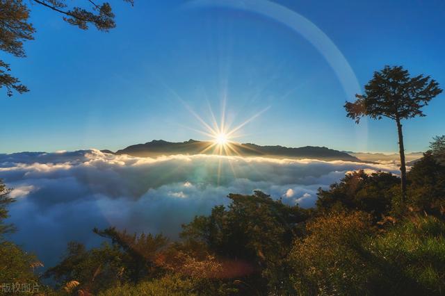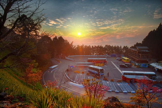 在阿里山名峰——祝山之巅的平台上,有一座漂亮的观日楼,是观看日出的最佳处。凌晨登临楼台,山中空气清新洁净,头上晨星点点,四周群山起伏,林涛声声。东方微露一抹红晕,淡若无有,却又似弥漫天空。刹那间,红光蓦地增强,远方玉山苍茫的轮廓突然镶上耀眼的金边,一瞬间,太阳似跳跃般地腾空出现在玉山上,万丈光芒四射,道道彩霞纷呈,青山翠谷,气象万千。