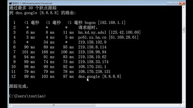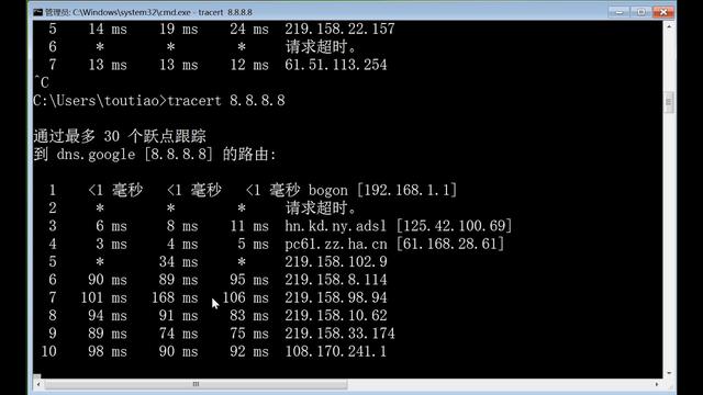 我们再测试一下国外的ip吧,比如谷歌的DNS,输入命令tracert 8.8.8.8,这个时候就开始测试这个ip了,由于他是国外的延迟会很高,也会经过了很多ip,跟踪路由会首先从自己的ip,到自己的省份,然后到中国,最后从中国到国外。