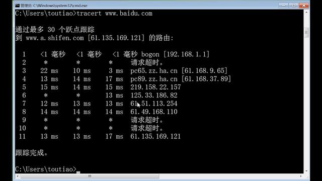 我们再测试一下百度输入命令 tracert www.baidu.com,这个时候就能看出来到达百度共有11个节点,每个节点有不同的延迟,在国内测试还是速度比较快的,中间有些请求超时,是该节点不允许跟踪,这个是正常情况。