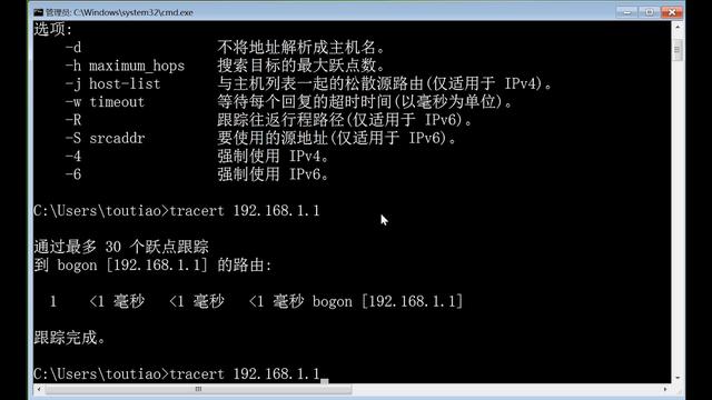 我们还是先测试一下到路由,这里直接输入命令tracert 192.168.1.1 就可以了,一共1个节点,所以就输出了一个信息,然后直接就会提示跟踪完成。