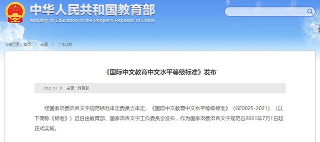 3月31日,教育部发布了《国际中文教育中文水平等级标准》,将学习者中文水平分为“三等九级”,这也是国家语委首个面向外国中文学习者,全面描绘评价学习者中文语言技能和水平的规范标准,该标准将于2021年7月1日起正式实施。