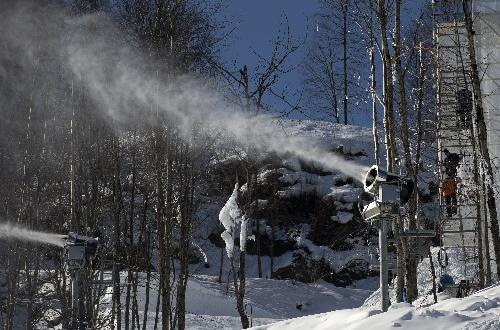 2014年2月4日,在索契玫瑰庄园极限公园,工作人员在造雪机旁工作。新华社记者费茂华摄