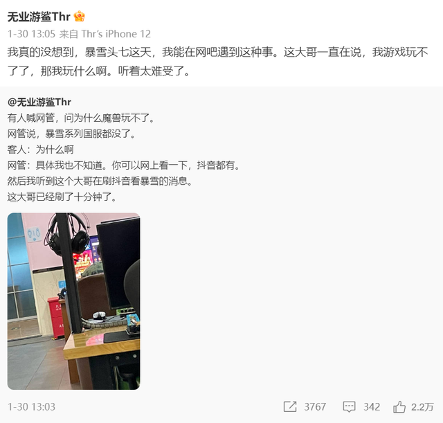 顾客询问网吧管理,为什么玩不了《魔兽世界》游戏?回答说“暴雪系列国服都没了”。在网管无法做出进一步解释之后,这个男人坐在那什么都没做,只是浏览暴雪游戏在国内停运新闻,接着便一直说着“我游戏玩不了了,那我玩什么啊”。分享此事的网友也感叹,“听着太难受了。”