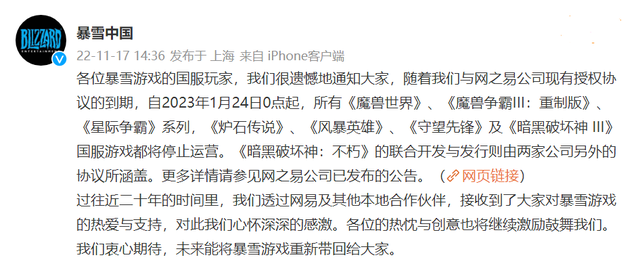 2022年11月17日,暴雪侧单方面发出公告,称除《暗黑破坏神:不朽》外的暴雪游戏因授权协议到期,将于2013年1月23日后暂停服务。此后网易方面发出公告,证实了双方在续约问题上未能达成一致,将着手关停暴雪游戏国服并安排退款,暴雪和网易的合作迎来终结。