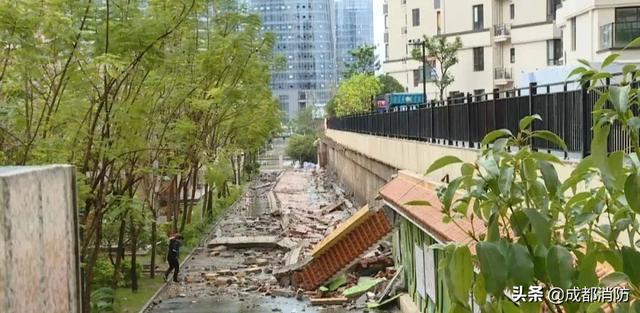 数十米长的围墙在大雨中倒塌