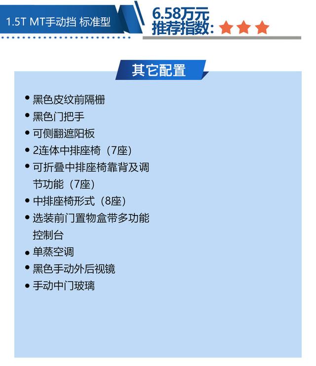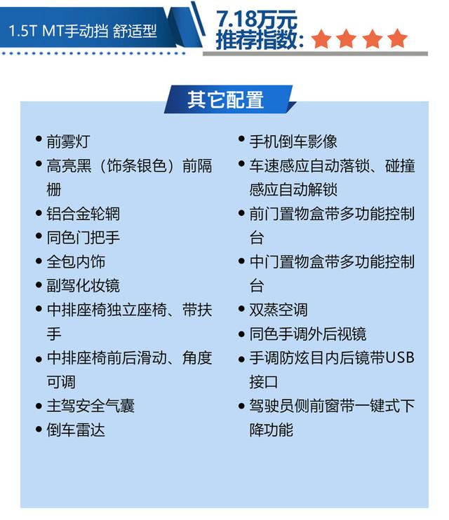 在1.5T MT手动挡 舒适型车型上,该车售价7.18万元。在配置上,现对于入门版车型要更为丰富。根据新车配置来看,新车搭载有钢板弹簧非独立式悬架系统、铝合金轮圈、全包内饰、副驾化妆镜、主驾安全气囊、倒车雷达、车速感应自动落锁、碰撞感应自动解锁、中门置物盒带多功能控制台、手调防炫目内后镜带USB接口以及驾驶员侧前窗带一键式下降功能等诸多使用性配置。