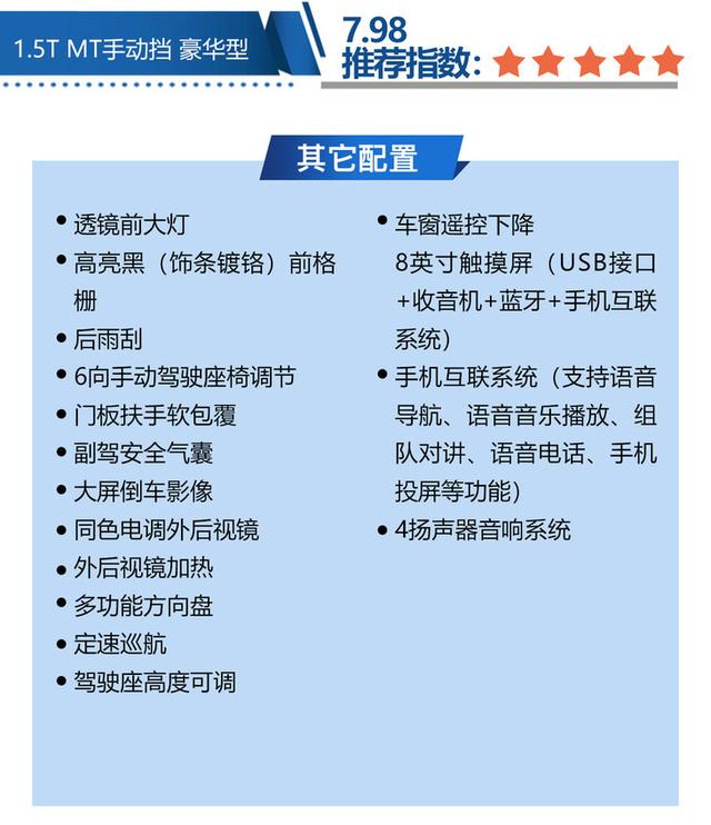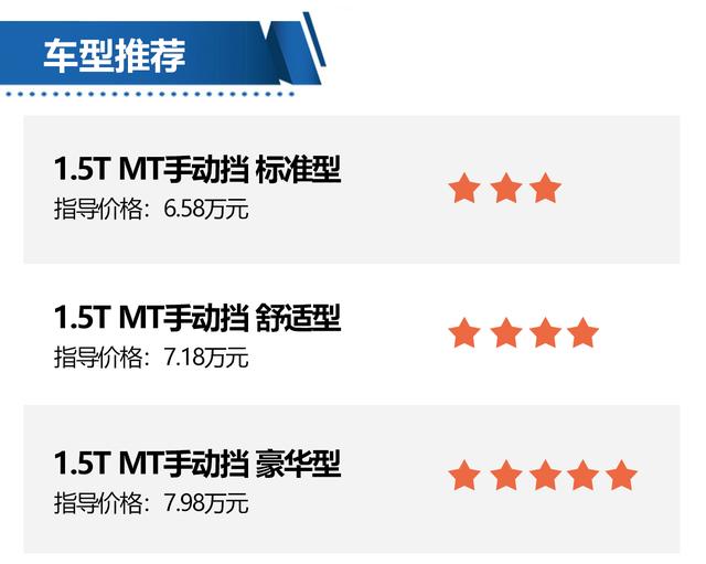 从上市的车型来看,此次上市的三款新车包含了1.5T MT手动挡 标准型、1.5T MT手动挡 舒适型以及1.5T MT手动挡 豪华型三款车,售价区间覆盖了6.58-7.98万元。行车视线通过对三款新车的配置以及售价进行综合分析后,为大家推荐的车型为顶配版。