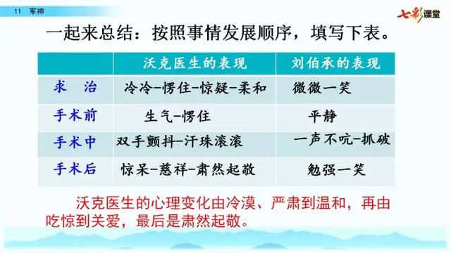 课文先写沃克医生给刘伯承检查眼睛伤势,发现这个“邮局职员”是个军人;接着写沃克给刘伯承做手术,刘伯承拒绝用麻药。最后写手术后沃克对刘伯承的钦佩。课文按事情发展的顺序并通过人物对话、神态的描写,表现人物的品质。