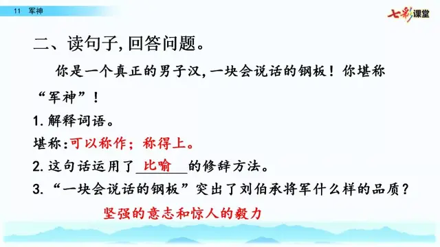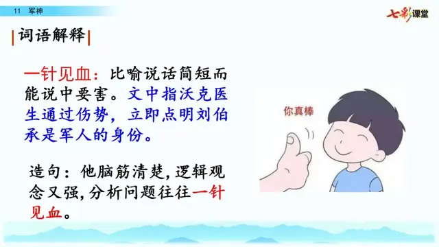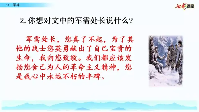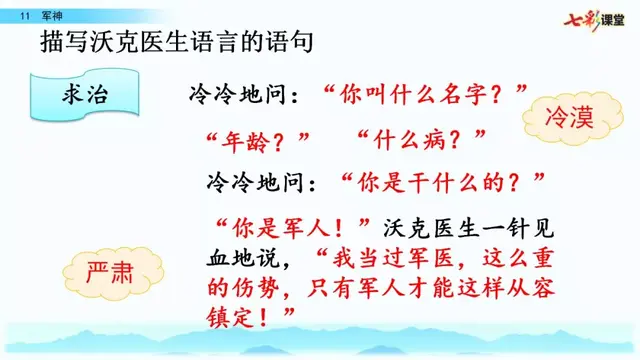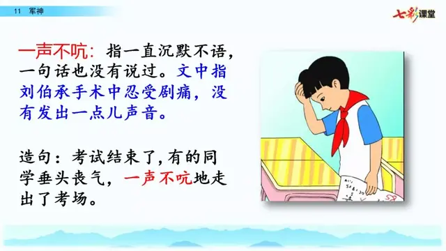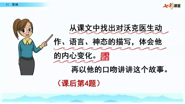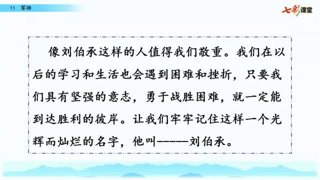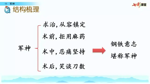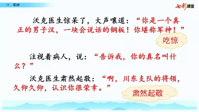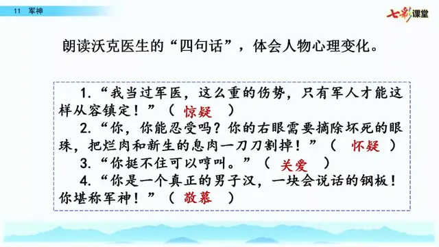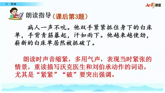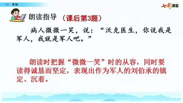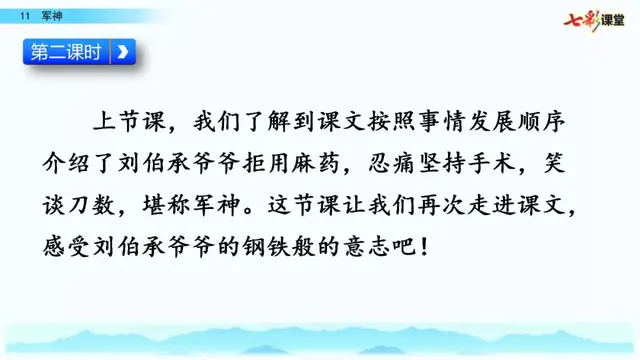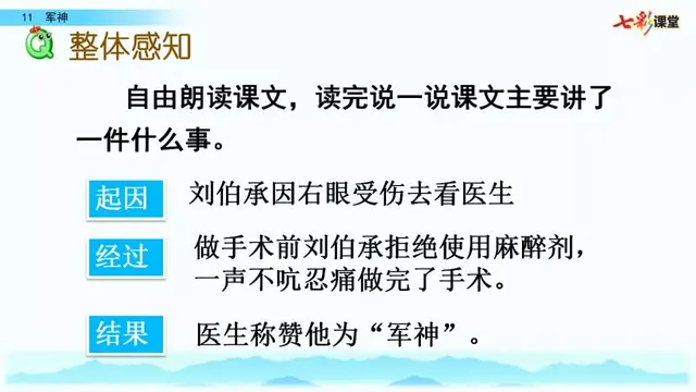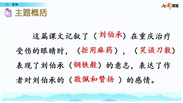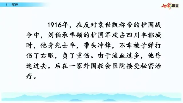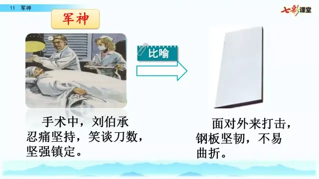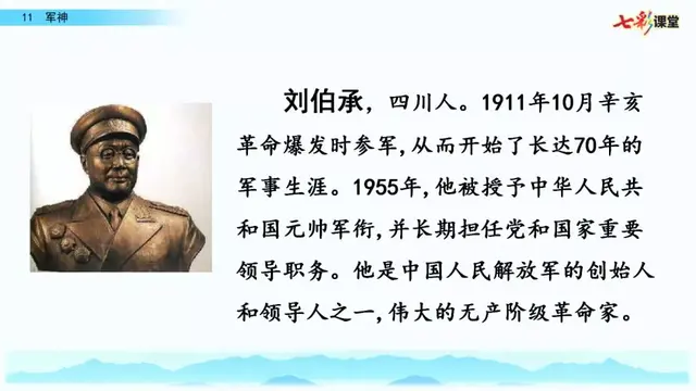 《军神》是统编版五年级小学语文课本的一篇精读课文。本文主要讲述了刘伯承到一家外国诊所做眼部手术,拒绝使用麻醉剂,为他做手术的外国医生沃克称他为“军神”的故事,赞扬了老一辈无产阶级革命家在严酷的革命斗争中表现出来的钢铁般的意志。本文以“手术前——手术时——手术后”为序组织材料,以人物对话为主线,推动故事向前发展,并通过对人物语言和沃克医生神态、情绪变化的描写来表现刘伯承钢铁般的意志。