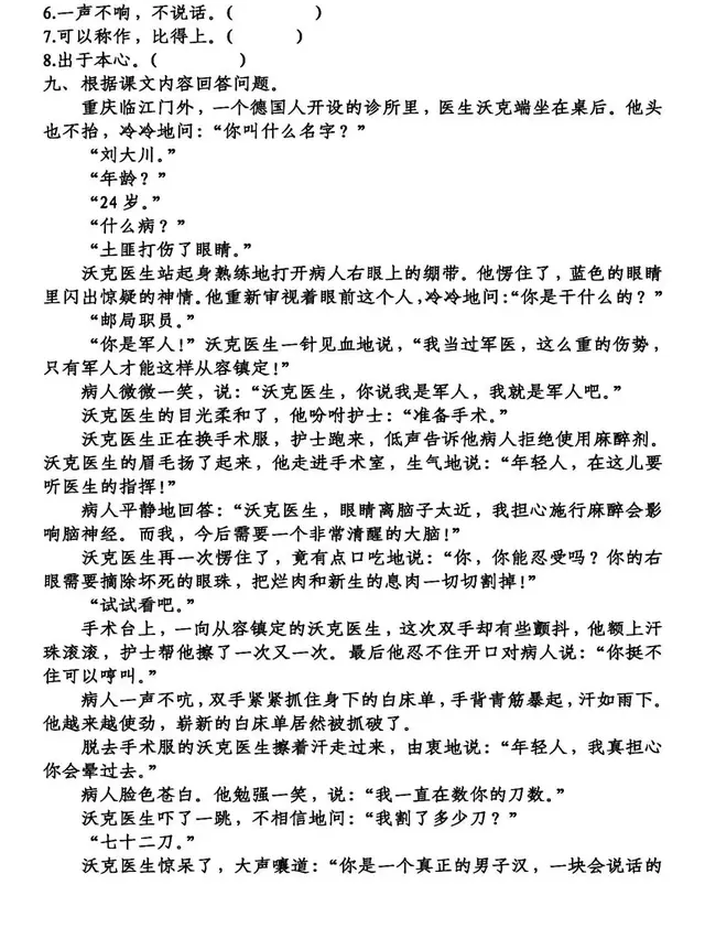 ( )讲手术台上病人汗如雨下,一声不吭,忍受着剧痛,还一直数着开刀的刀数,医生称赞病人是真正的男子汉,是会说话的钢板,是军神。