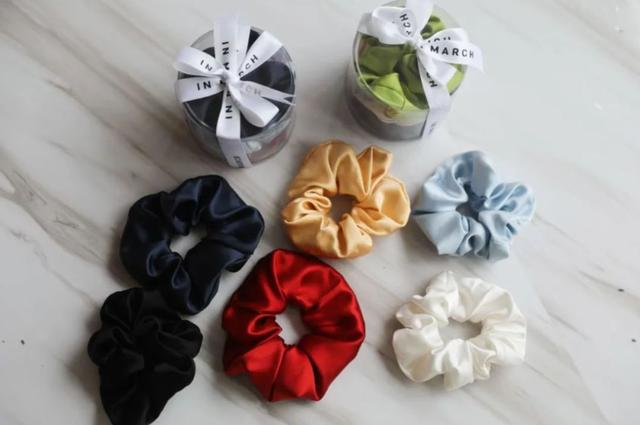 IN MARCH就有这种真丝发圈,它主要的好处是不会扯到头发和头皮,柔滑的质地还能让秀发更加顺滑闪亮,舒适的松紧圈还能防止发丝因为扭转和拉扯而折断受损,呵护你的发丝~选择非常多样,还有一种随性优雅的法式风格,可以说是精致girl必备啦~