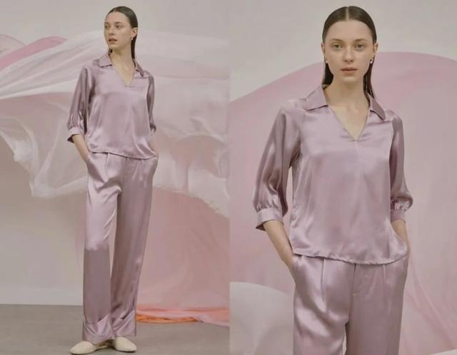 如果你想要比睡袍更简洁的款式,可以考虑这套霜紫色真丝套装,中袖上衣和长裤的组合,温柔又不失气场。