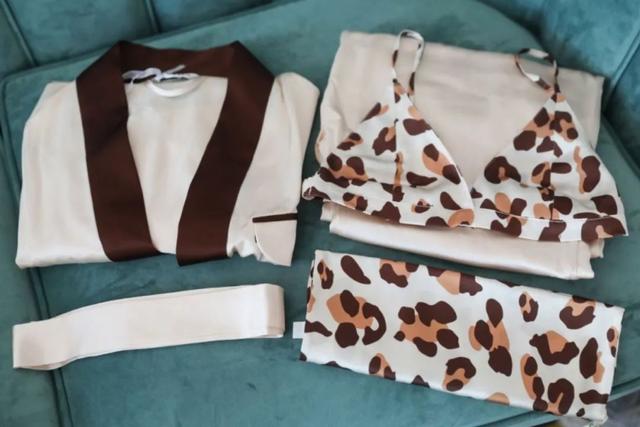 睡袍是22姆米桑蚕丝,自带华丽丝滑质感,除了搭配腰带,还会附赠真丝比基尼上衣和收纳袋,豹纹印花多了一点小野性~