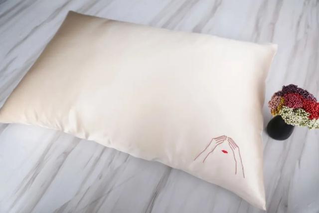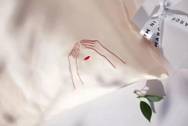 别出心裁的是,枕套右下角还带有红色刺绣,红唇+双手捂住眼睛的图案,既有创意又有点可爱,十分精致特别↓