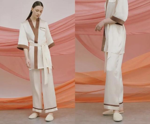 这款睡袍还有配套睡裤,直筒造型剪裁流畅,出门穿也无压力。