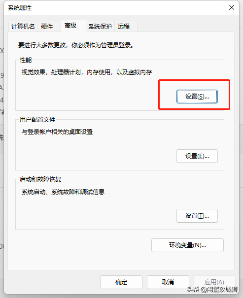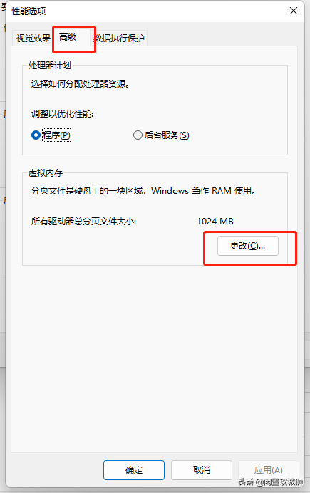 在性能选项里选择高级,在虚拟内存选项框内点击更改