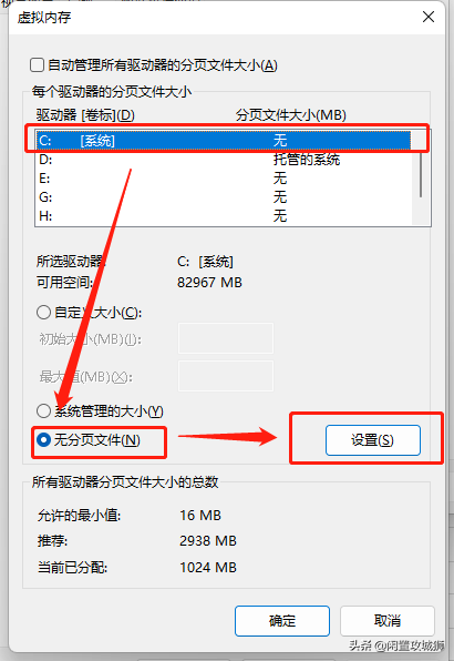 接下来还要把C盘的虚拟内存关掉,选择C盘——无分布文件——设置
