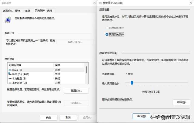 这个除非是一些品牌机自带的原装系统,否则开启这个选项的还是很少的,一个系统还原点还是挺占空间的,就别说有多个的了。禁用方法可以参考上一步进入高级系统设置后禁用即可,这种情况较少就不多做介绍了,可参考下方图片。