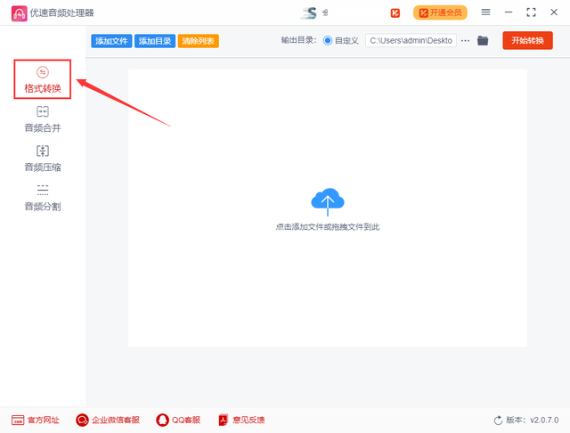 步骤一:我们打开提前在电脑上下载安装的“优速音频处理器”软件工具,在首页左边的四个功能中选【格式转换】功能选项,点击进入下一步;值得注意的是,软件支持多种音频格式的相互转换,方便用户使用;