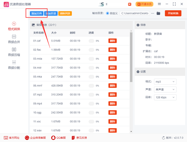 步骤二:点击内页左上角的【添加文件】按钮,把我们准备好的音频文件全部添加到软件里,等待转换指令;文件可以批量添加进行批量转换;