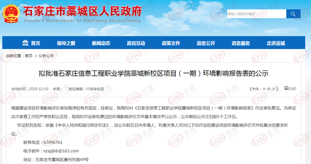 乐居买房石家庄讯12月3日,新浪乐居从藁城区人民政府官网获悉,石家庄信息工程职业学院藁城新校区项目环境影响报告表正在公示中。建设地点为一期工程位于藁城区张家庄镇蔡家岗村南,规划安济路以南、天 宁路以北、怀德大街以东,飞跃街以西。项目总投资398117.19 万元。