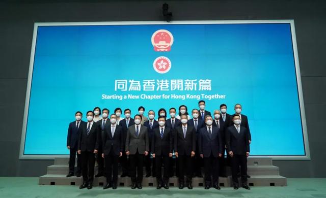 6月19日,李家超率新班子亮相。(大公文汇全媒体资料图)中央人民政府6月19日根据候任行政长官李家超的提名,任命第六届香港特别行政区政府的主要官员。当日下午2时30分,李家超首次率领新班子亮相。
