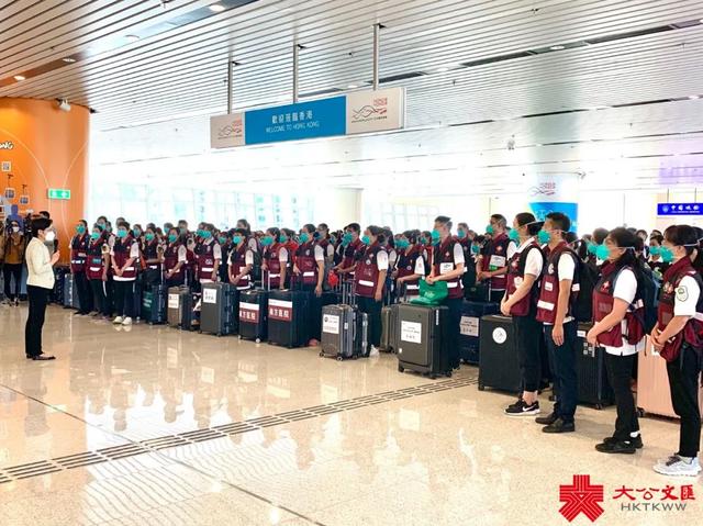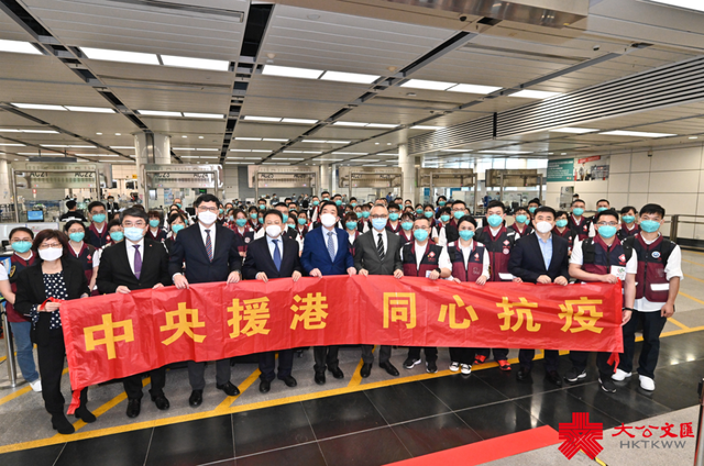 内地医护援港抗疫。(资料图片)2022年初,香港爆发第五波疫情,医疗系统承受前所未有的压力。3月16日下午2时半,应香港特区政府请求,由广东省组派的内地援港医疗队300人抵港,配合特区政府开展病人救治工作,帮助香港尽快稳控疫情。时任行政长官林郑月娥到香园围口岸迎接,并代表特区政府和所有香港居民对内地医护来港支援表示衷心感谢。