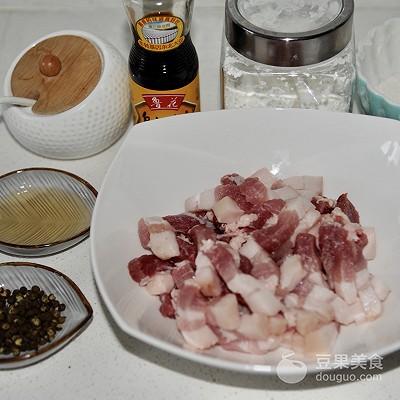 1、准备食材 五花肉切小块 料酒 酱油 麻椒 玉米淀粉 面粉盐