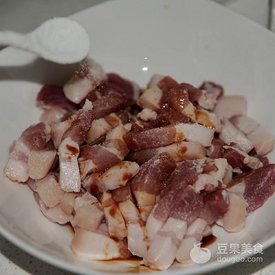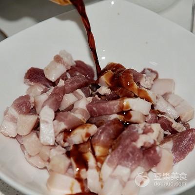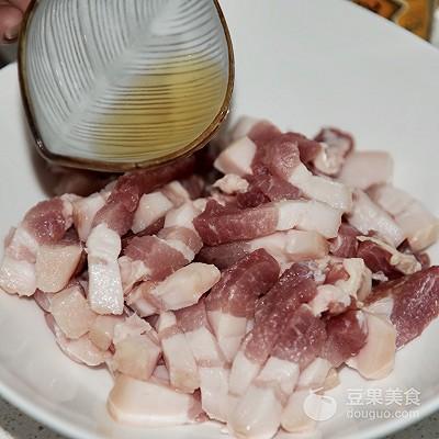 2、将料酒带入五花肉中拌匀