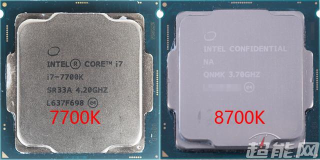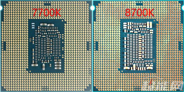 大家可以从照片上看到Core i7-8700K的外形与Core i7-7700K是完全一样的,针脚位置也一样,然而它是无法在200/100系列主板上使用的,只能搭配300系列主板使用,Intel给出的官方解析是要支持6核处理器必须重新设计主板,特别是供电部分,虽然说这说辞确实很可疑,但这手法在当年的LGA 775主板上也出现过,915主板用不了奔腾D,早期945主板用不了Core 2,给出的答复都是说供电改了所以不能用。