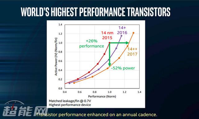 Coffee Lake的另一个变化就是所用工艺从原来的14nm+升级到14nm++,自从2015年14nm工艺投产以来Intel一直在改进工艺,在不提升功耗的情况不断提升性能,14nm++工艺比初代14nm工艺性能提升26%,或者功耗降低52%。