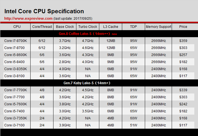 首批上市的第八代酷睿处理器共六款,具体规格如下: