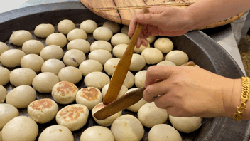 将月饼坯子放在平底锅上烙,师傅拨动两块竹片,时不时翻转一下,等月饼两面金黄酥脆才能出锅,这样做的鲜肉月饼表皮更加酥脆。