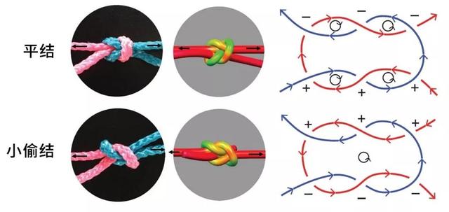 平结和小偷结(看起来一模一样,但人们拉拽他们的方式不一样,参考左图中的黑箭头) | Reproduced from Ref. 1