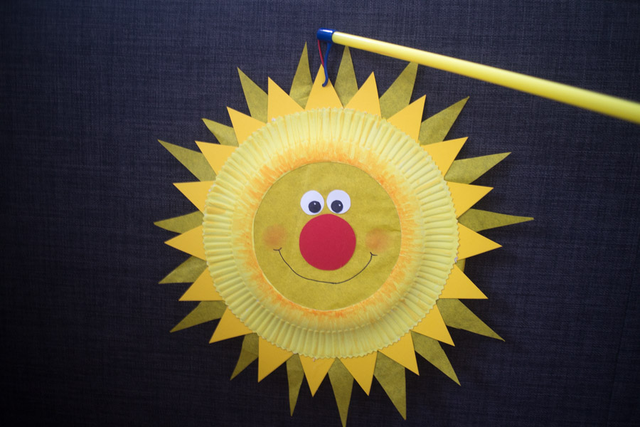 - 切掉纸盘的底部,一张略大的半透明棉质粘在底面。用彩纸剪一些三角形,贴在纸盘边缘一圈;剪红鼻头和眼睛,贴在一个纸盘的底面。