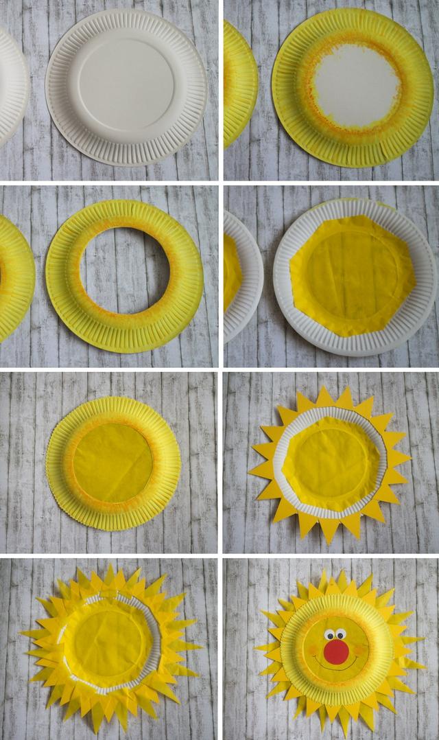 - 将两个纸盘翻到背面,用黄色颜料涂一圈边缘。