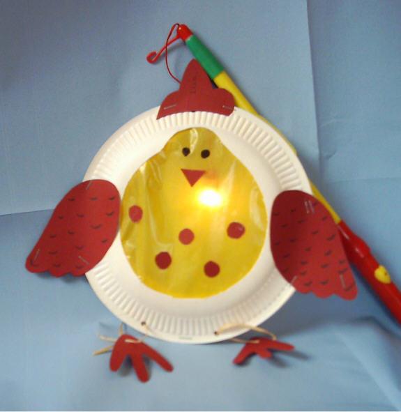 2个纸盘,半透明棉纸(黄色),彩纸,彩笔,剪刀,胶水,棍子(提灯笼用)