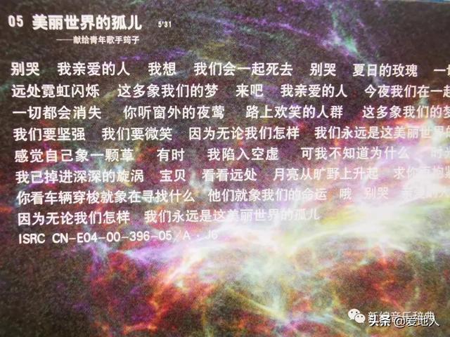 不知道是不是因为突发事件,所以《美丽世界的孤儿》从音乐属性上,在这张专辑里也很像是“孤儿”,仅仅只是以鼓机作为节奏的这首歌曲,很明显不是和其它作品同一体系的产物,从编曲的层面,听起来相当单薄。