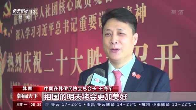中国在韩侨民协会总会长王海军:我们坚信,二十大后,中国的发展道路会更加宽广,祖国的明天会更加美好。作为生活在韩国的华侨华人,我们将紧紧跟随祖国的坚定步伐,为实现祖国统一和民族伟大复兴,作出无愧于时代的贡献。