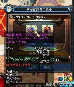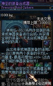 神圣的装备合成器:使用后,可以将两件封装的稀有装备进行合成,并获得全新的装备。(无法合成神器装备中的防具)。合出传承或神器装备的适用Lv,会以原有两个装备的平均Lv为基准,最高可增加Lv10。(远古地下城的神器装备除外)。称号、锁定状态下或者蕴含有异界气息的装备无法进行合成。这个仪器被赋予了神圣的力量,应该会个使用者带来好运!