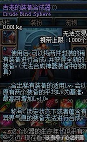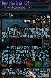精制的装备合成器:使用后,可以将两件封装的稀有装备进行合成,并获得全新的装备。(无法合成神器装备中的防具)。合出稀有装备的适用Lv,会以原有两个装备的平均Lv为基准,最高可增加Lv10;传承或神器装备最高可增加Lv5。(远古地下城的神器装备除外)。称号、锁定状态下或者蕴含有异界气息的装备无法进行合成。这个仪器的手工非常精制,应该是谁的心血之作。