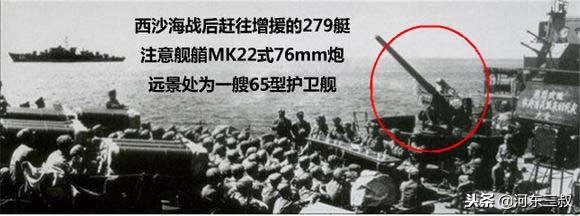 在中越西沙海战作为增援舰艇没赶上作战(参战的都是装备双管57mm舰炮的037猎潜艇),不过有意思的是,越方参战舰艇陈庆瑜号 (舷号4)、日早/怒涛号(舷号10)两舰都装备有MK22型76mm舰炮,二战时期的美制舰炮差点在中越海战中对决,从侧面也反应了当年我军装备的落后。