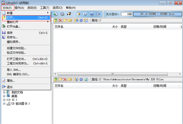 1、首先在个人PC中插入U盘,然后打开软件UltraISO,选择『打开』,加载待刻录的 ISO文件。
