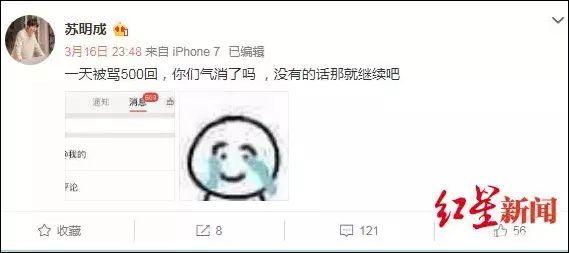 更搞笑的是,一个名为“苏明成”的微博账号称,自己一天被骂500回。