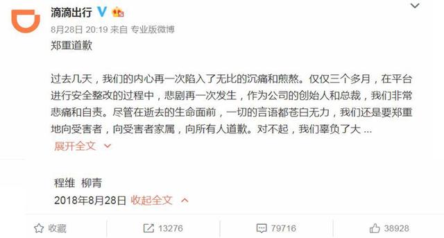 “过去几天,我们内心再一次陷入了无比的沉痛和煎熬。”程维和柳青在公开信《郑重道歉》中写道。