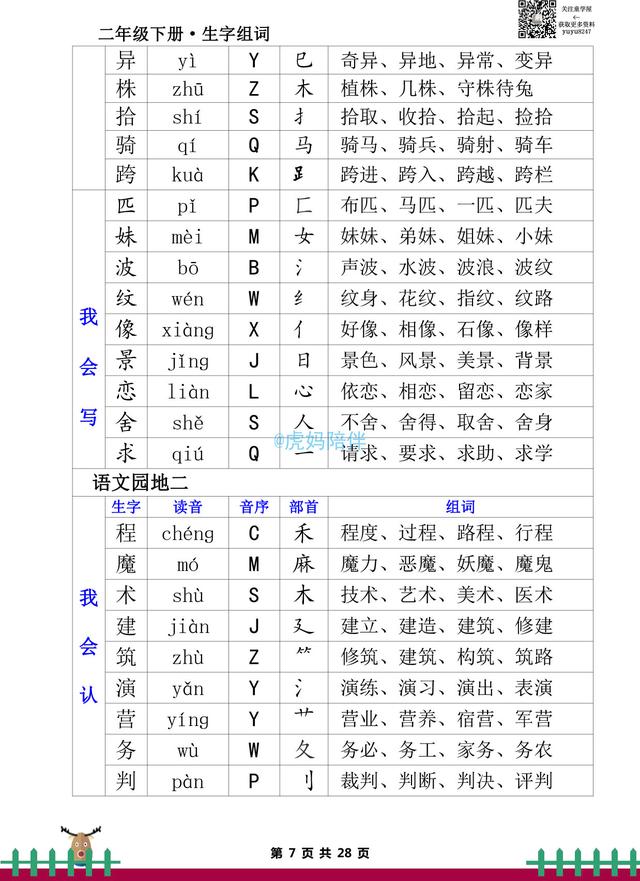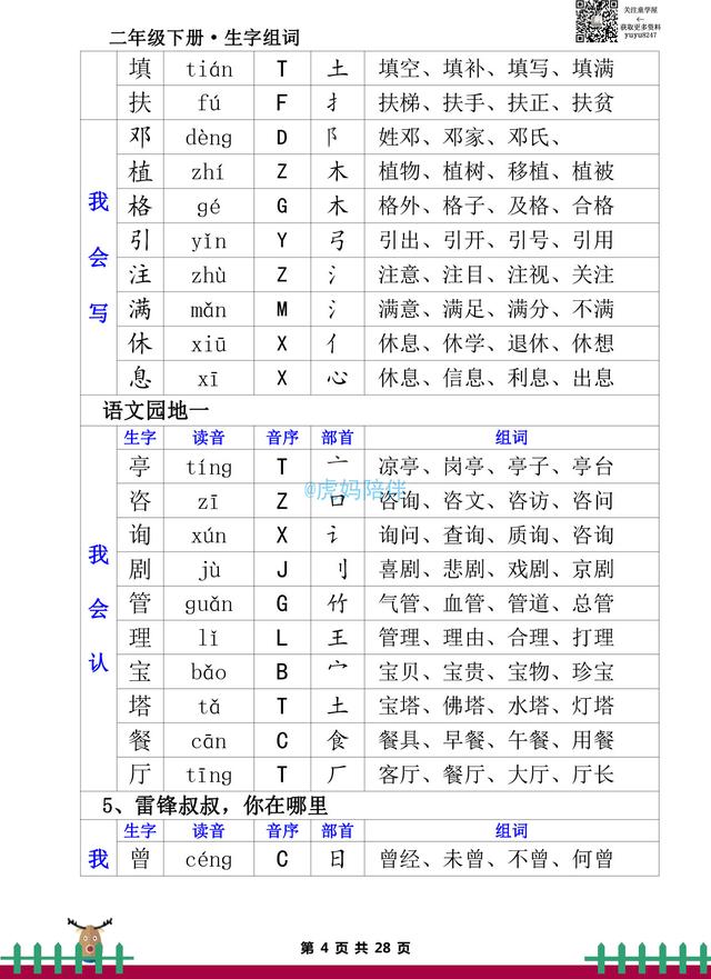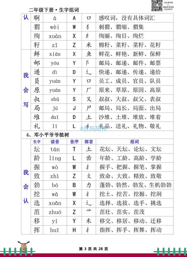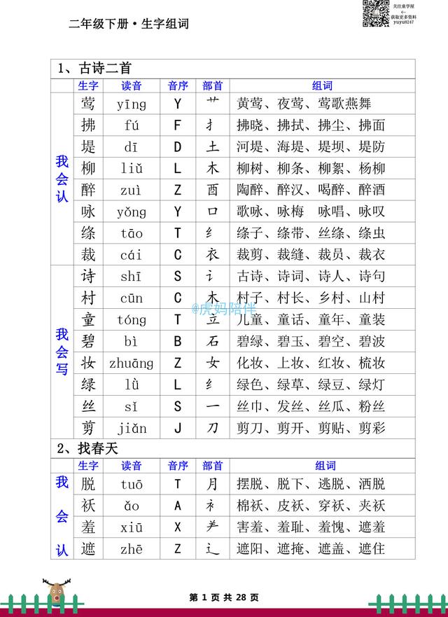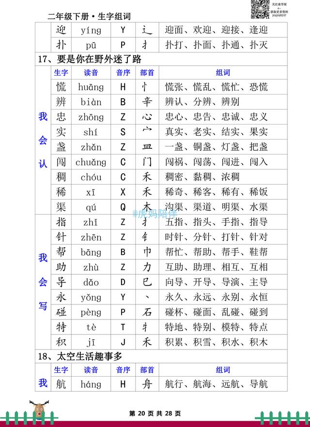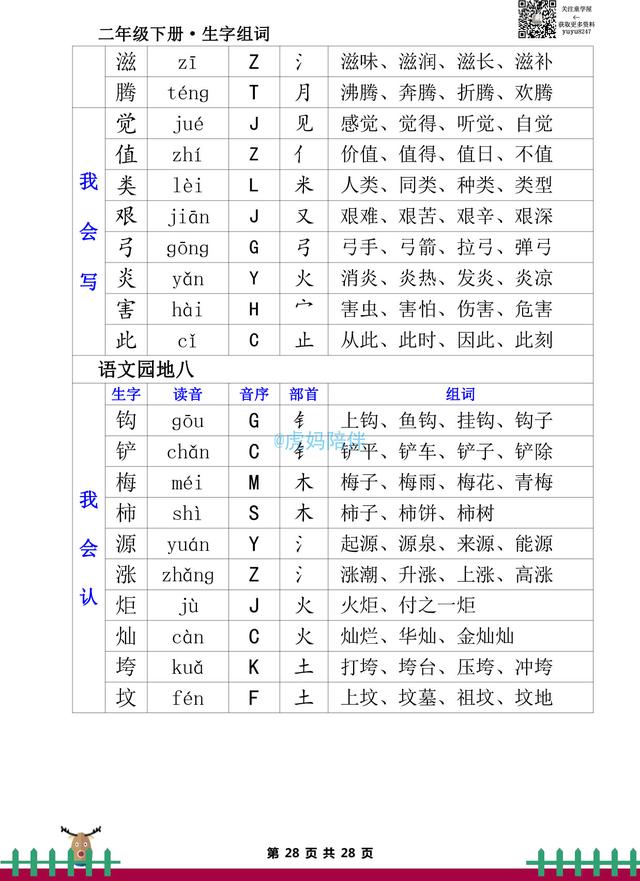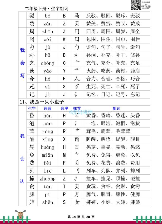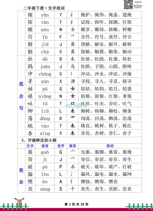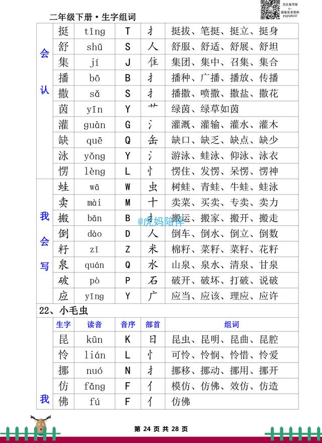 生字组词包含:读音、音序、部首、组词,二年级的语文学习,字词基础依然是重点学习内容。一二年级打好基础,升入高年级以后,语文学习将会轻松很多(可以打印粘贴课本),家长们可以给孩子打印出来进行练习。