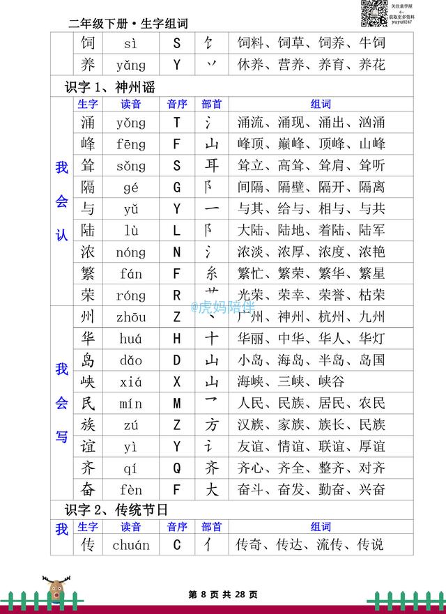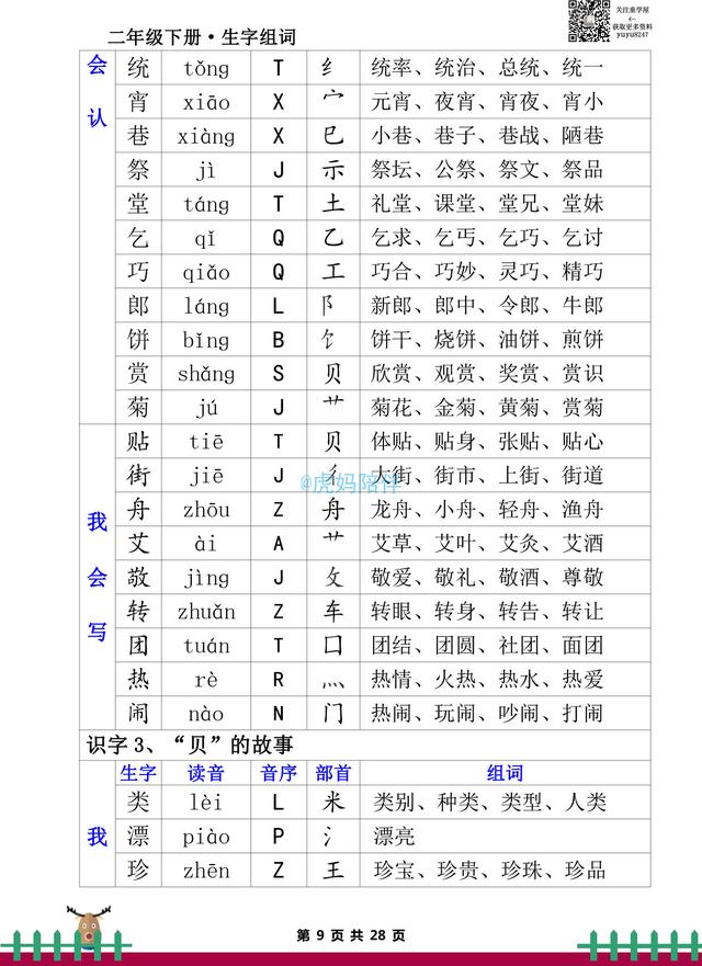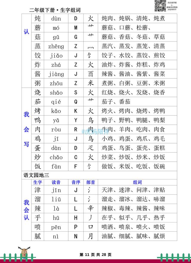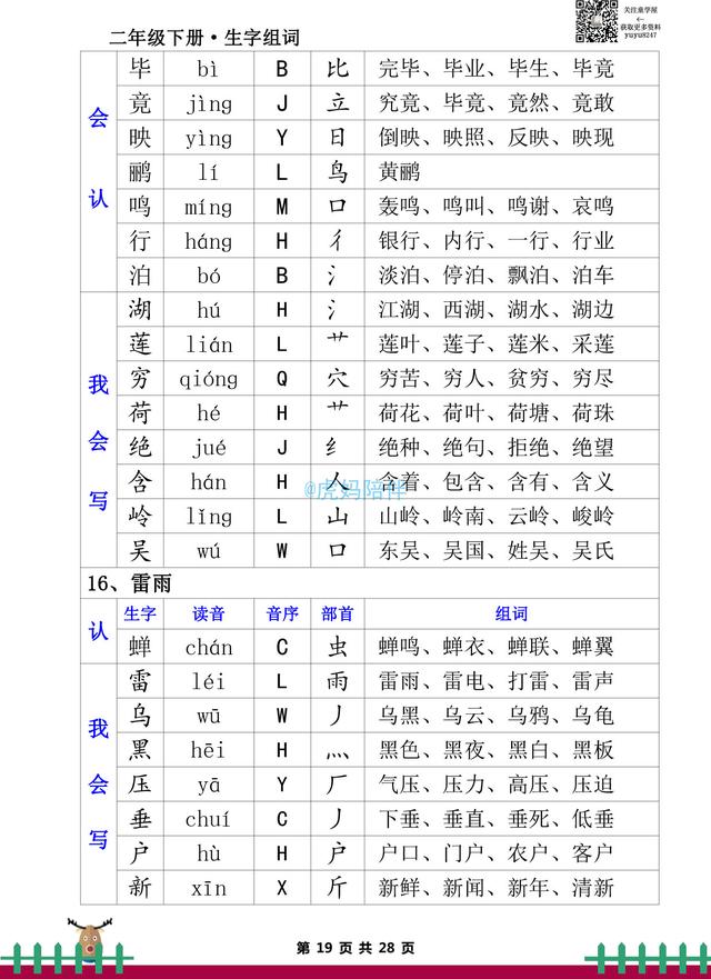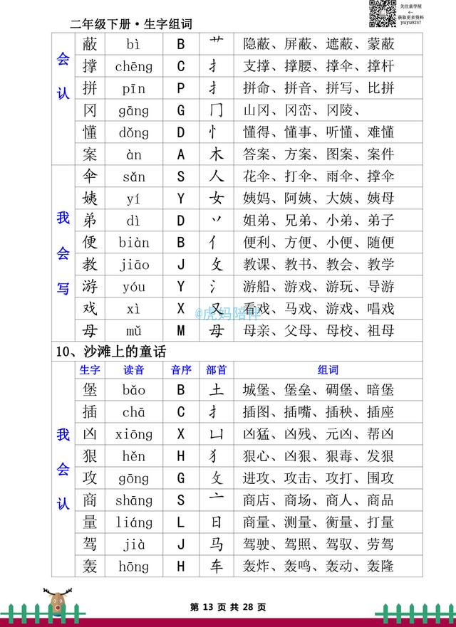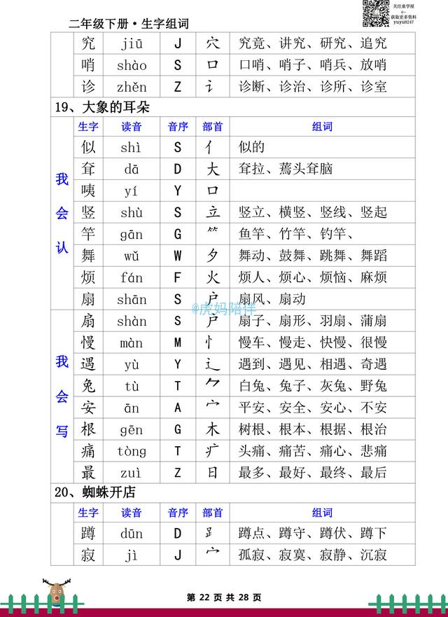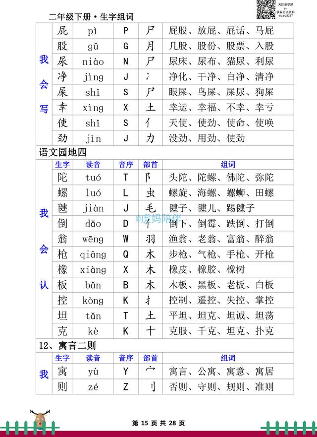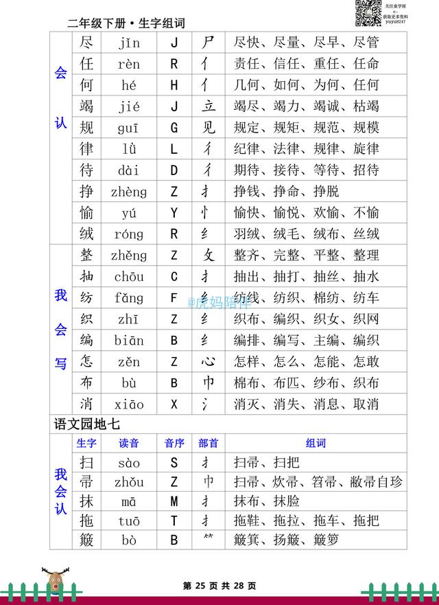 生字组词包含:读音、音序、部首、组词,二年级的语文学习,字词基础依然是重点学习内容。一二年级打好基础,升入高年级以后,语文学习将会轻松很多(可以打印粘贴课本),家长们可以给孩子打印出来进行练习。