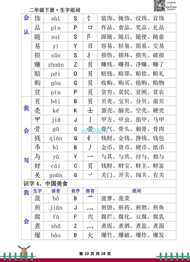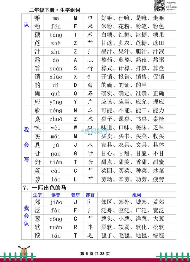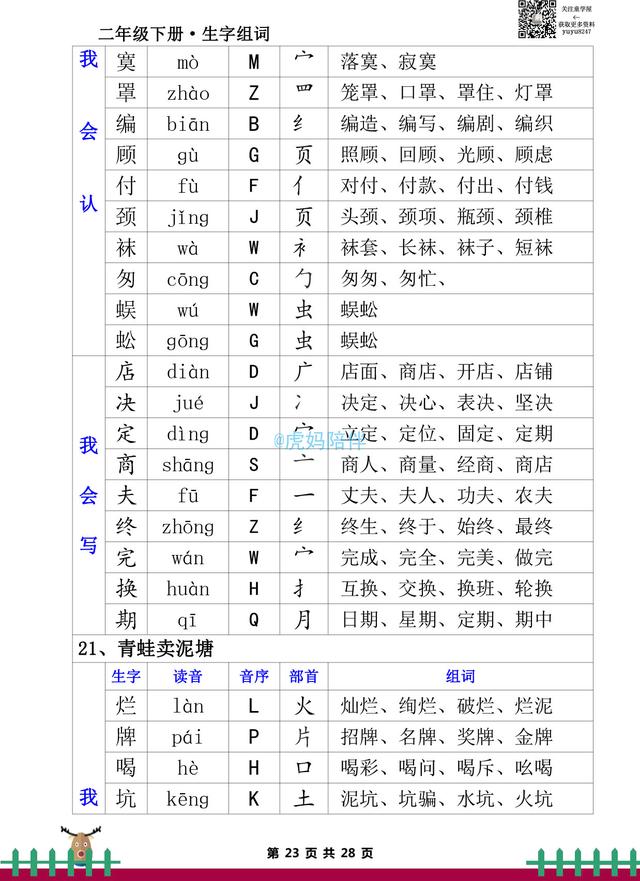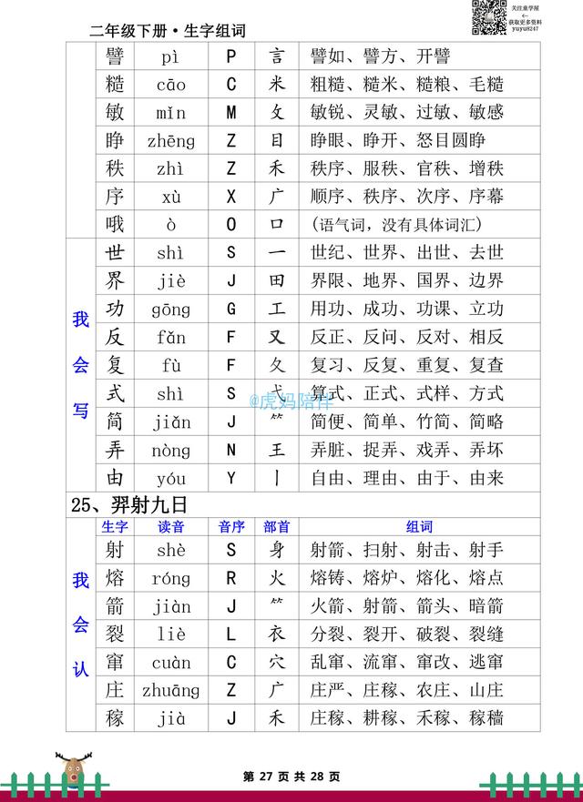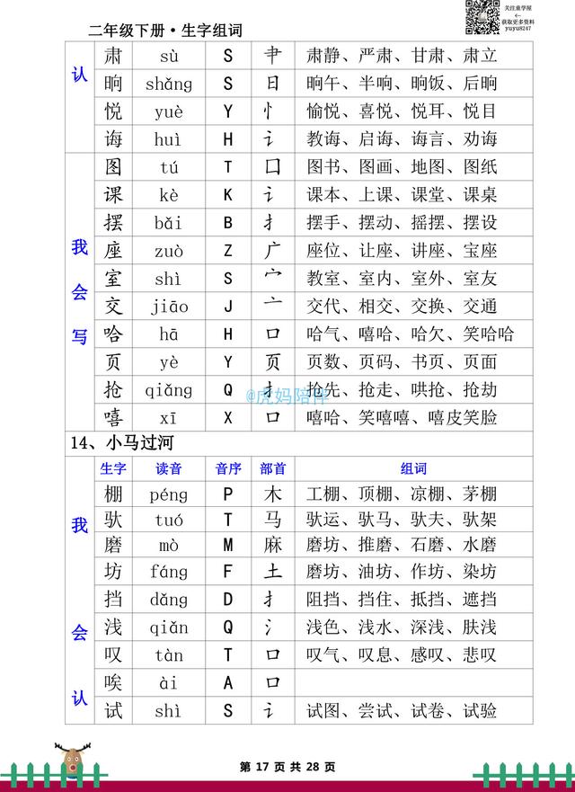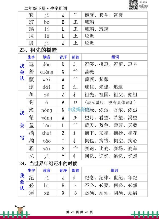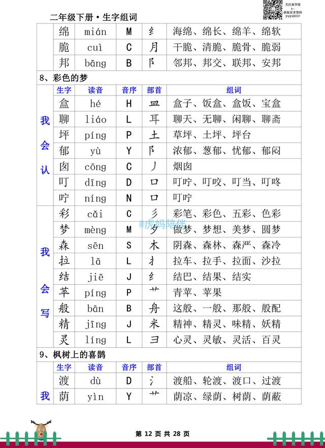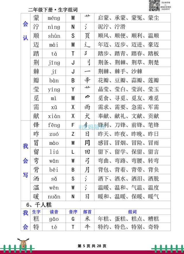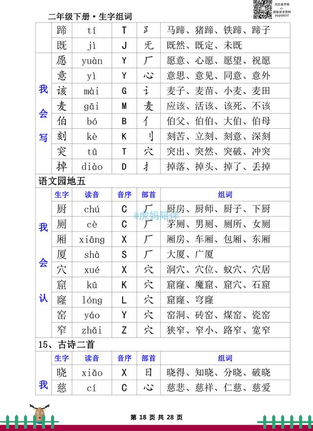 生字组词包含:读音、音序、部首、组词,二年级的语文学习,字词基础依然是重点学习内容。一二年级打好基础,升入高年级以后,语文学习将会轻松很多(可以打印粘贴课本),家长们可以给孩子打印出来进行练习。