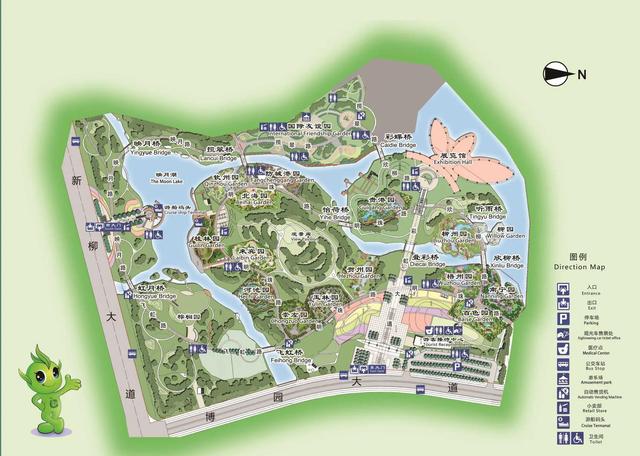 它位于柳州柳东新区九子岭,距离柳州市中心25公里,占地68万平方米。其中绿化面积近42万平方米,水域面积12万多平方米。种植植物300多种,名贵树木10多种,乔灌木8万多种,绿化覆盖率达到80%以上。整个园区布局规划4大区域:1展园区2滨水休闲区3公共服务区4生态绿化区域,处理这四大区域以外还有6大广场:1主入口广场2形象广场3喷泉广场4开闭幕式广场5花卉广场6温室广场。整个展区由14个地级市城市的广西展园和23个国际友好城市展园组成。广西园区的14个展园分别是南宁、柳州、桂林、梧州、北海、防城港、钦州、贵港、玉林、百色、贺州、河池、来宾和崇左。它们风格迥异、精彩荟萃、集中展示了各城市不同的园林艺术和人文历史,堪称“秀美八桂”的缩影。23个国际友好城市展园来自东盟、欧美、亚洲、非洲和大洋洲,展示了别样的异域风情,到此一游便可周游列国,体验异国情调。